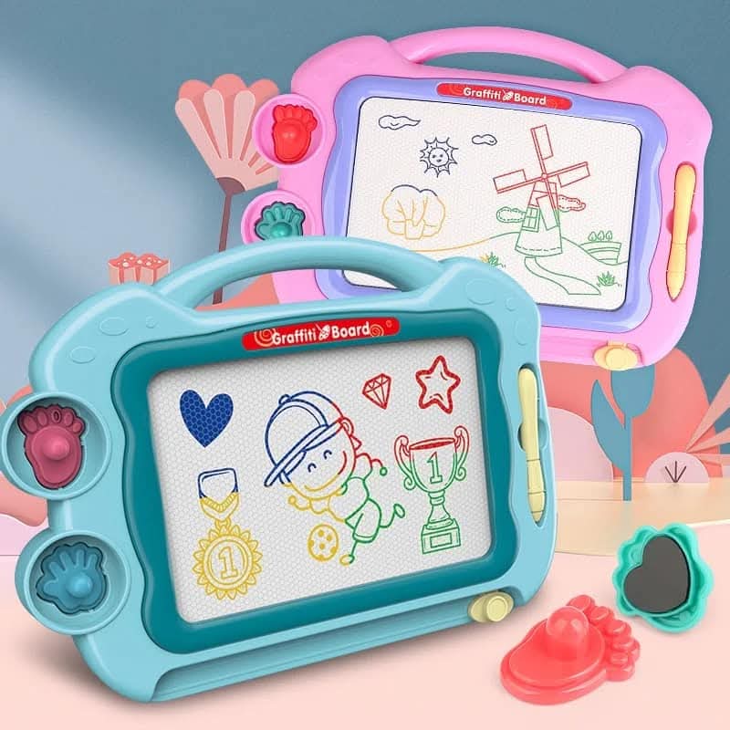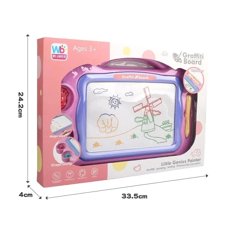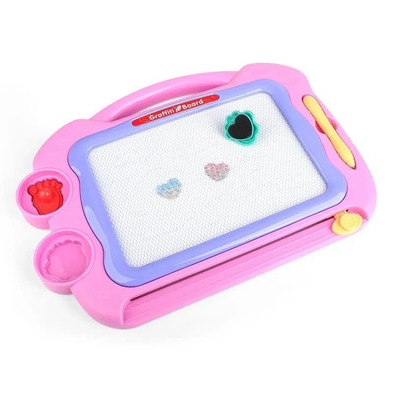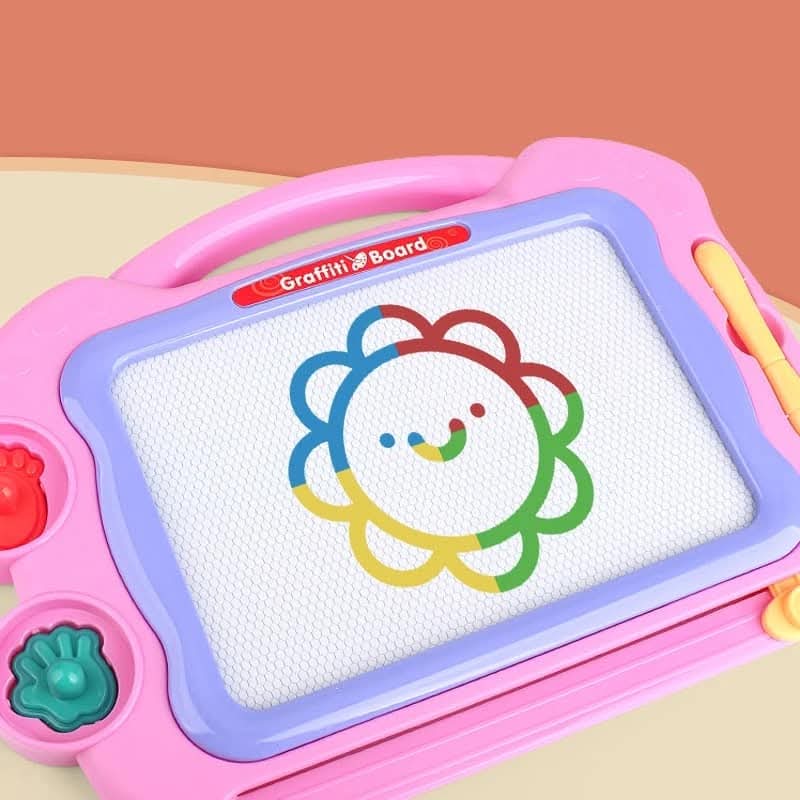 Magnetic Drawing Board – A colourful, mess-free way for kids to draw, write, and play. Includes pen, stamps, and easy-slide eraser for endless fun.